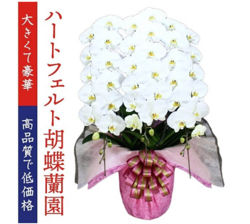 昇進や就任祝いには胡蝶蘭通販ベストフラワーのハートフェルト胡蝶蘭園 白大輪 3本立36輪以上がおすすめです。